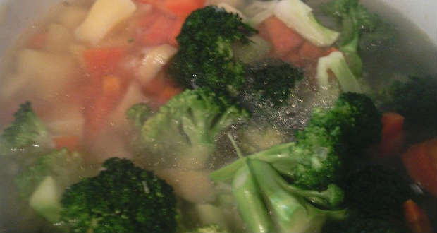 5 perc főzés után hozzáadjuk a brokkolit és a zöldborsót, és még 5-7 percet főzzük.