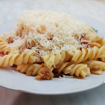 A tésztát a csomagoláson található előírás szerint forró, sós vízben kifőzzük és leszűrjük, majd összekeverjük a darált hússal. A tésztát tálaláskor megszórhatjuk sajttal.