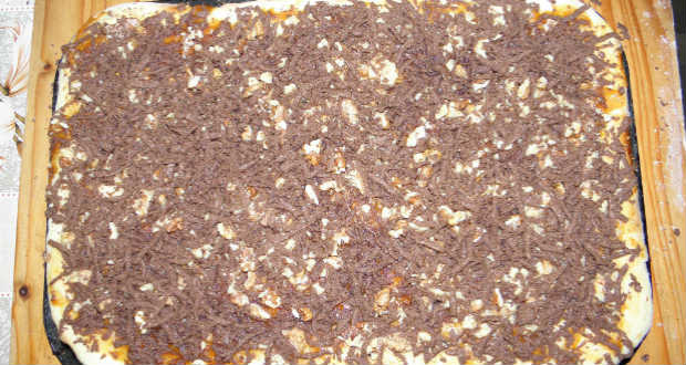 Ezt megkenjük lekvárral, majd megszórjuk darabos dióval és ráreszeljük a barna tészta 1/3 részét.