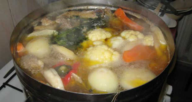 Mikor az összes habot leszedtük, belerakjuk a felszeletelt zöldségeket: sárgarépát, karalábét, petrezselymet, hagymát, fokhagymát, szemes borsot, paprikát, karfiolt.