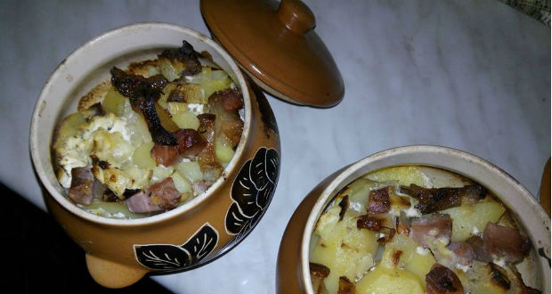 Adagonként egy-egy edényt vajazzunk ki. Elsőként a krumpli felét tesszük az edényekbe, majd a szalonna, sonka, tojás, hagyma és az ízesített tejföl felét. Megismételjük a műveletet és a végén lefedjük az edényeket. Sütőben 20 percig, 180 fokon készre sütjük.