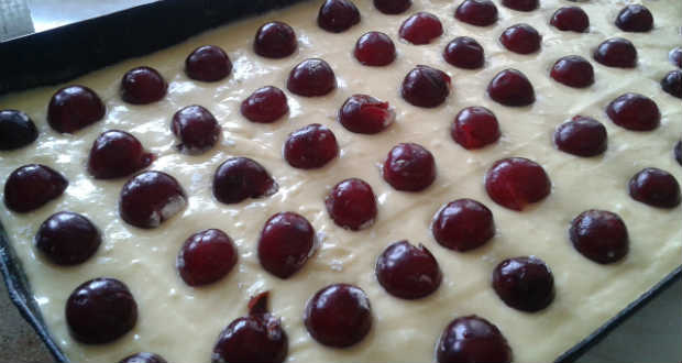 A meggyet megmossuk és kimagozzuk. Lisztbe mártva ráhelyezzük a tészta tetejére. A lisztbe mártogatás azért szükséges, hogy a meggy ne süllyedjen le a tészta legaljára.