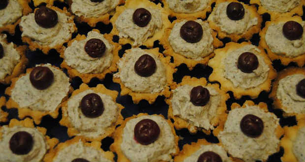 Ha a kosárkák kihűltek, akkor mindegyiket megtöltjük krémmel, és a tetejére egy-egy szem cseresznyét vagy meggyet teszünk.