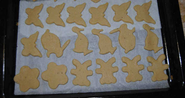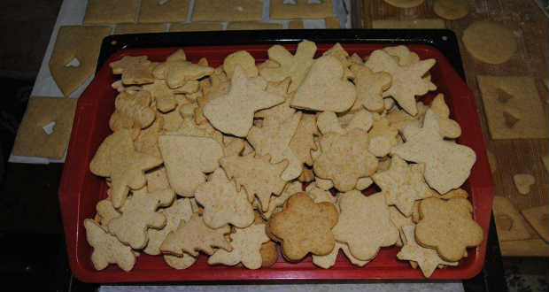 Aztán a tésztát fél centi vékonyra nyújtjuk, formákkal kiszaggatjuk és előmelegített sütőben megsütjük.