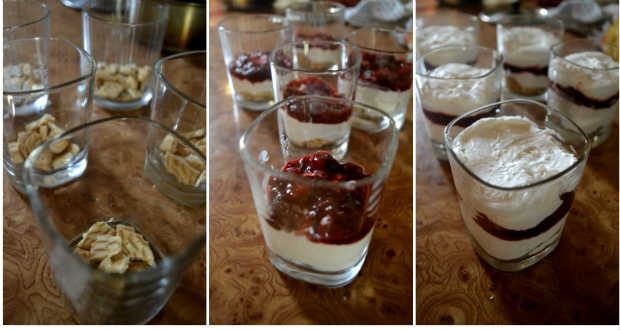Összerakjuk a pohárkrémet: a poharak aljára tegyünk kekszet, majd rétegezzük rá a túrókrémet. Én habzsákból nyomtam, de egész nyugodtan lehet kanalazni is. Ezután jön egy gyümölcsös réteg, majd ismét túrókrém. Ismét egy kekszréteg jön, majd a túrókrémmel zárjuk a sorozatot.