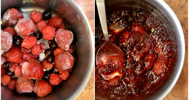 A gyümölcsökből és az 1 evőkanál kristálycukorból lekvárszerű anyagot főzünk lassú tűzön. Miután elkezd főni még kb 5 percig hagyjuk a tűzőn, majd hűtsük le.