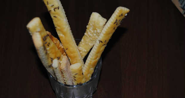 Majd derelyemetszővel egy centi vastag csíkokra szaggatjuk, és előmelegített sütőben aranysárgára sütjük.