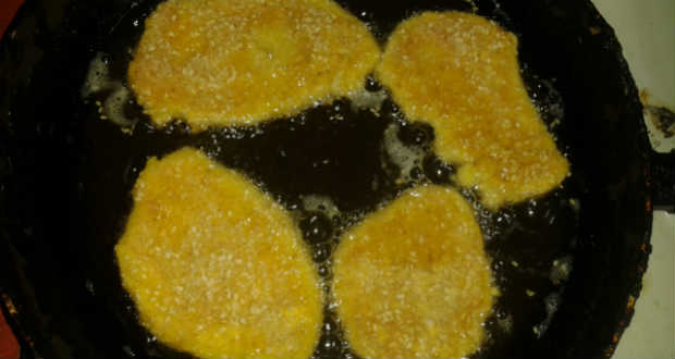 Forró olajban mindkét oldalát közepes lángon pirosra sütjük.